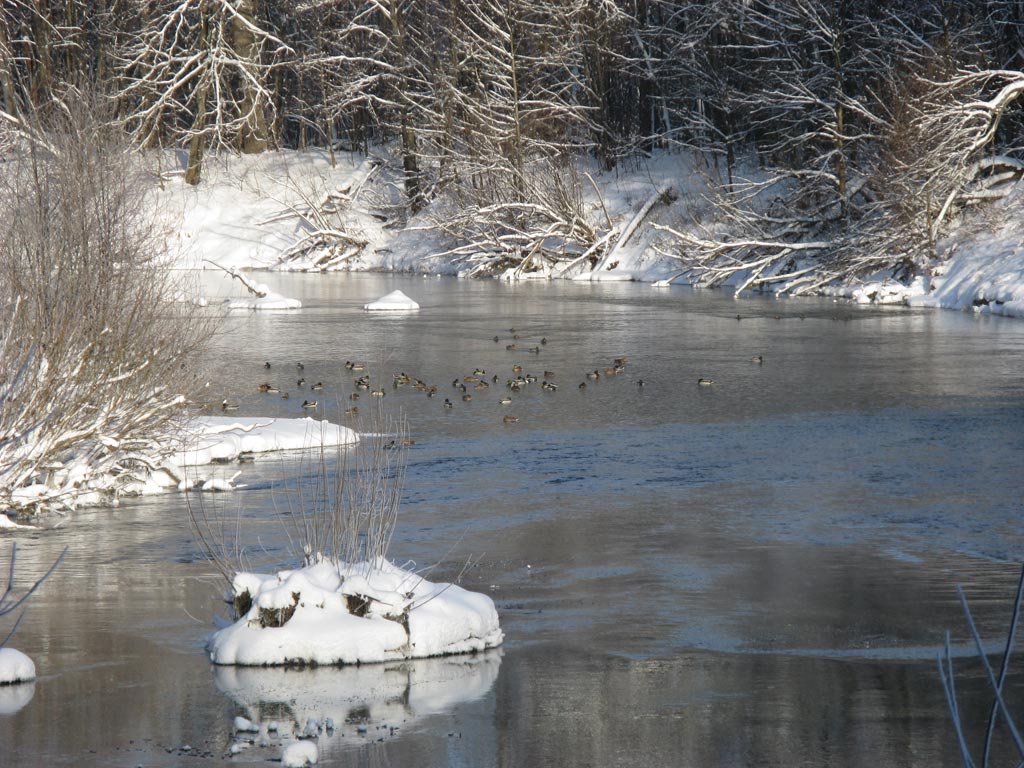 ) ). Без приключений добираюсь до санатория. Цель - посетить самые баянистые места данной местности. Сначала - Илеть и Зелёный ключ. На воротах санатория висит "кирпич". Приходиться объезжать по пробитой недавно в свежевыпавшем снеге колее. Вскоре колея выводит на прочищенную трактором, ведущую вниз дорогу. Вот и площадка у ключа, возле которого бродит народ пенсионного и предпенсионного возраста, набирая воду. Прохожу вдоль берега Илети. Вода парит на морозе. Подальше, в излучине, плавают утки. Подпускают к себе поближе, но на жужжание выезжающего объектива фотоаппарата реагируют нервно - часть пытается улететь, остальные спешно уплывают подальше. Возвращаюсь к ключу. Вода выходит из подножия горы. Дно кажется зеленоватым. Пройдя чуть дальше, по тропе, обнаруживаются т.н. "поющие ключи", бъющие из дна песочными гейзерочками.