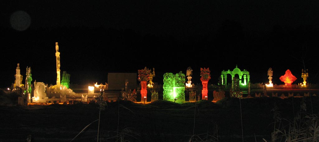 . Всё, дальше цивилизация! Ухожу через Большие Ключи на Раифу. В монастыре - толпы народа. На озере - ледяные фигуры с цветной подсветкой. Всё загорожено, пришлось фотографировать из-за ограды.