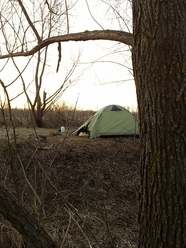 с мыслью, как доеду до дома начал разбирать пакет-стену. И наконец то появились первые лучи солнце. Открыв дверцу палатки обнаружили, что она уже теплая и в двоем залезли туда и поспали около 2 часов наверное... Меня разбудил голос друга который напевал песню "кручу,кручу,кручу педали, кручу как птица лечу". Выйдя к нему уже выспавшись увидел как он клеит камеру, на вопрос когда успел, ответ был таков "да я вон в ту деревню съездил" и показывает на горизонт :O Вспомнил снова про пятую точку по массировал ее, и пошел будить нашу "мокрую ногу"