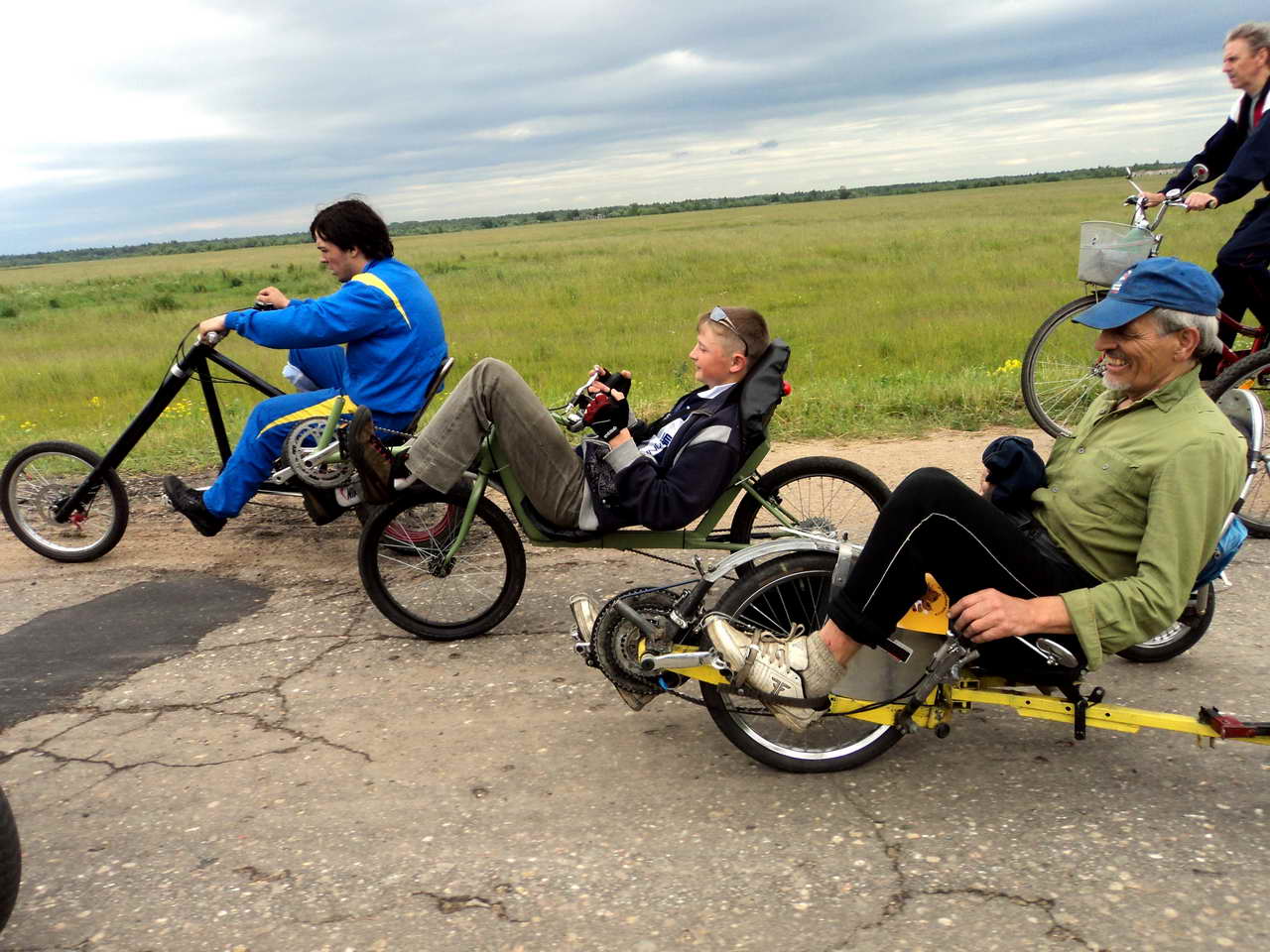 К 11 часам Чопер, Денис и Эдик собрали свои байки и тоже прикатили на площадь. Произошло торжественное открытие: свои речи произнесли официальные лица и организаторы. Начал накрапывать дождик, но люди были к этому готовы и вмиг облачились в дождевики и куртки всех цветов радуги. Объявили о регистрации, проходившей тут же в палатке у сцены. Стоимость регистрации на все мероприятия составляла 500 рублей, мы же ограничились лишь велопробегом Углич – Ордено (200 р), а Денис и Эдик записались на веломобильную гонку «1067 метров». Вскоре все было готово к гонке, прозвучало традиционное «На старт, внимание, марш!» и энтузиасты рванули вдоль по улице. Сразу выявился лидер – им оказался парень на низком скоростном лигераде, который и финишировал первым с большим отрывом.