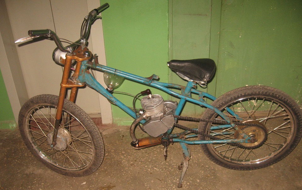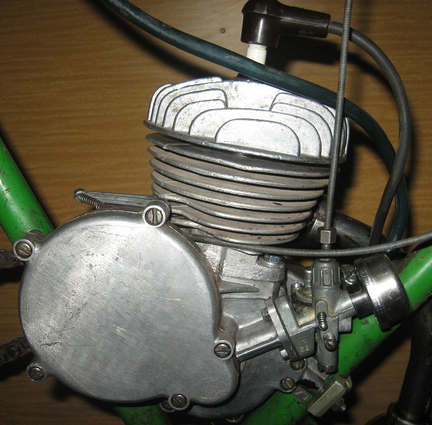 Имеется сильное желание собрать такой аппарат. В наличии имеется вполне рабочий, вычищенный, и даже более-менее настроенный мопедный двигатель Д6 (45кубов, 1,2л.с., предназначался также для установки на дорожные велосипеды), моторная цепь, пара ведомых звёзд от мопеда, пара колёс от Риги-11 и потрёпанная Рига-7. Впринципе, этого супового набора даже и хватило бы на сборку мопеда, но вот мысль немного другая. :roll: