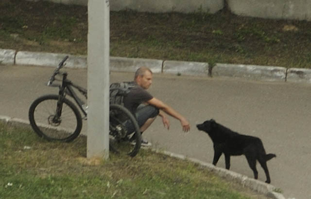из окна дома сфоткал. проехал паренёк, собака за ним. он уселся и давай с ней разговаривать)