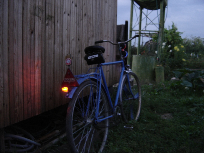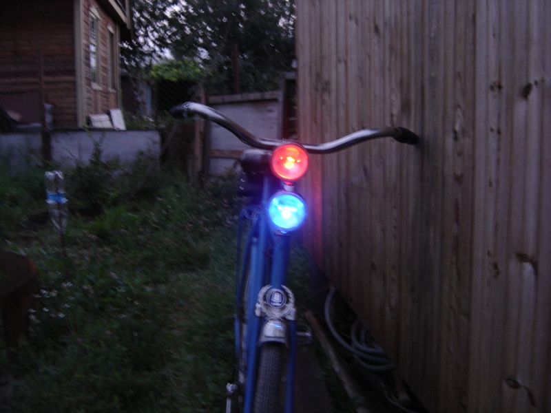 Электрика:установлены 2 передние фары-переделаные! вместо ламп накаливания,стоят светодиоды.Впоследствии красные(на фото) были заменены на белые,в качестве дальнего света. сзади-установлена-мини-фара габарит. там тоже стоит красный светодиод! все это для экономии электроэнергии. в дальнейшем было вмонтировано еще 2 светодиода,в углы Отражателя-треугольника.В качестве питания всего-этого был взят аккумулятор для плеера.